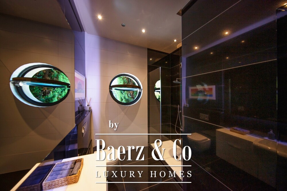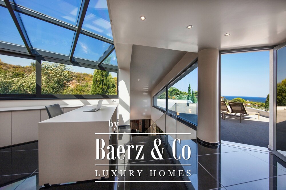 Главная резиденция, занимающая 280 м² на первом и втором этажах, располагает тремя спальнями и тремя ванными комнатами. Просторная гостиная зона с кухней и столовой — 154 м² — выходит на террасу площадью 160 м² с бассейном шесть на четыре метра. Остеклённые балюстрады открывают бесперебойные виды на море, горы и природу. В отделке использован серо-чёрный гранит, немецкие рамы Schüco и межкомнатные двери из оливкового дерева, что подчёркивает безупречный выбор материалов.