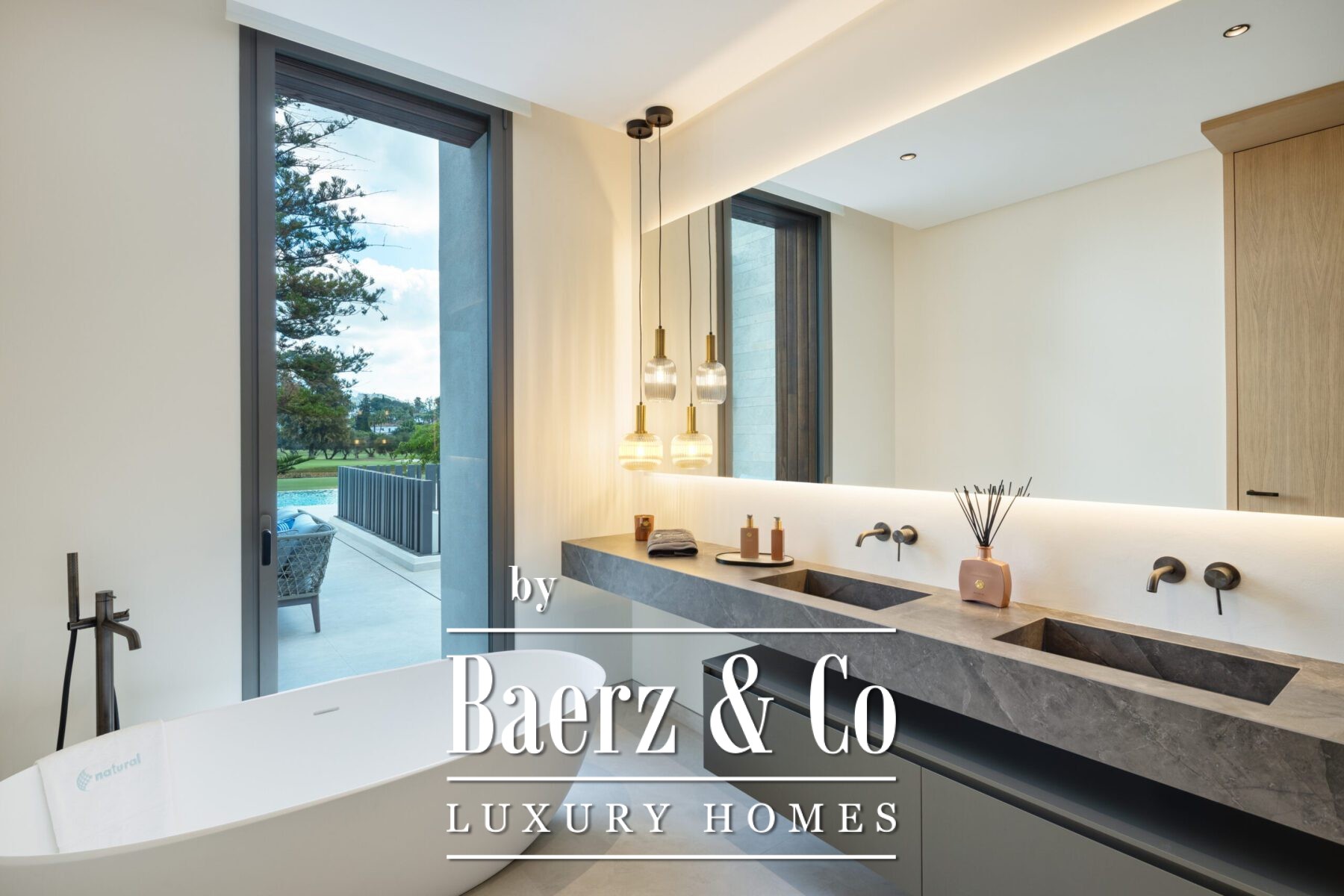 Внутри пять спален с индивидуальными ванными комнатами и дополнительный гостевой санузел создают впечатление простора и достойный уровень комфорта как в повседневной жизни, так и при приеме гостей. Высокие потолки, панорамные окна и премиальная отделка формируют атмосферу, которую гармонично дополняют теплое LED-освещение, деревянные вставки и тщательно интегрированный камень. Просторная кухня оснащена техникой высокого класса, большим островом и открывает панорамные виды на бескрайний бассейн, джакузи и поля для гольфа. Каждая главная зона расположена так, чтобы максимально использовать солнечный свет и обрамлять панорамные перспективы на гору Ла Конча, гольф-поле и спокойное озеро.