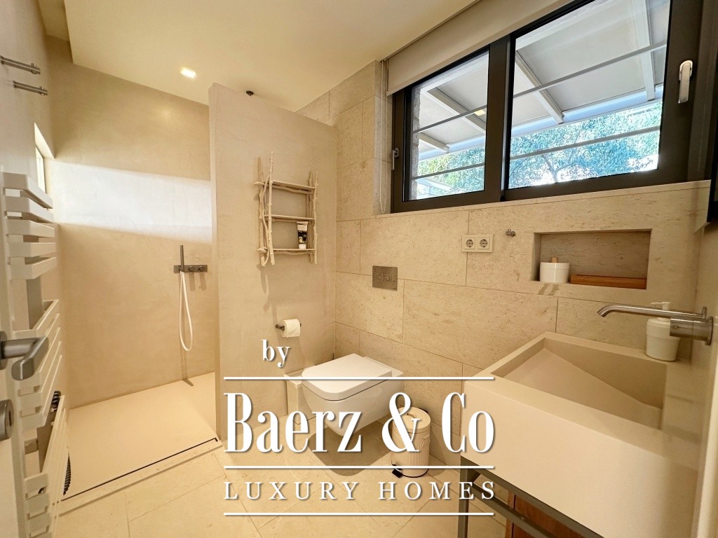 Гостевой дом отличает светлый, открытый план с полностью оборудованной кухней, двумя спальнями с ванными, гардеробной и частной террасой с видом на бассейн. Прямой доступ к инфинити-бассейну размером 11 на 3,5 метра и просторным зонам отдыха придаёт атмосфере сдержанную роскошь. Технологии и комфорт воплощены в системах безопасности, видеонаблюдении, инверторном тепловом насосе, тёплых полах и кондиционировании, солнечном водонагреве и интеллектуальном поливе.