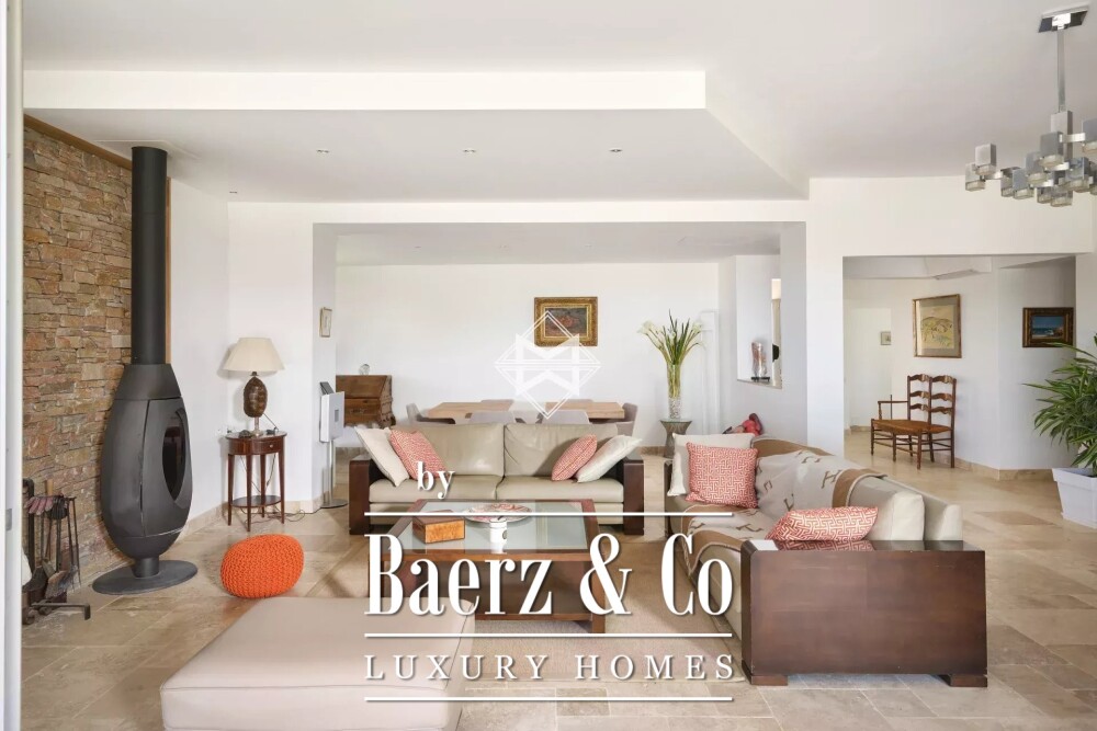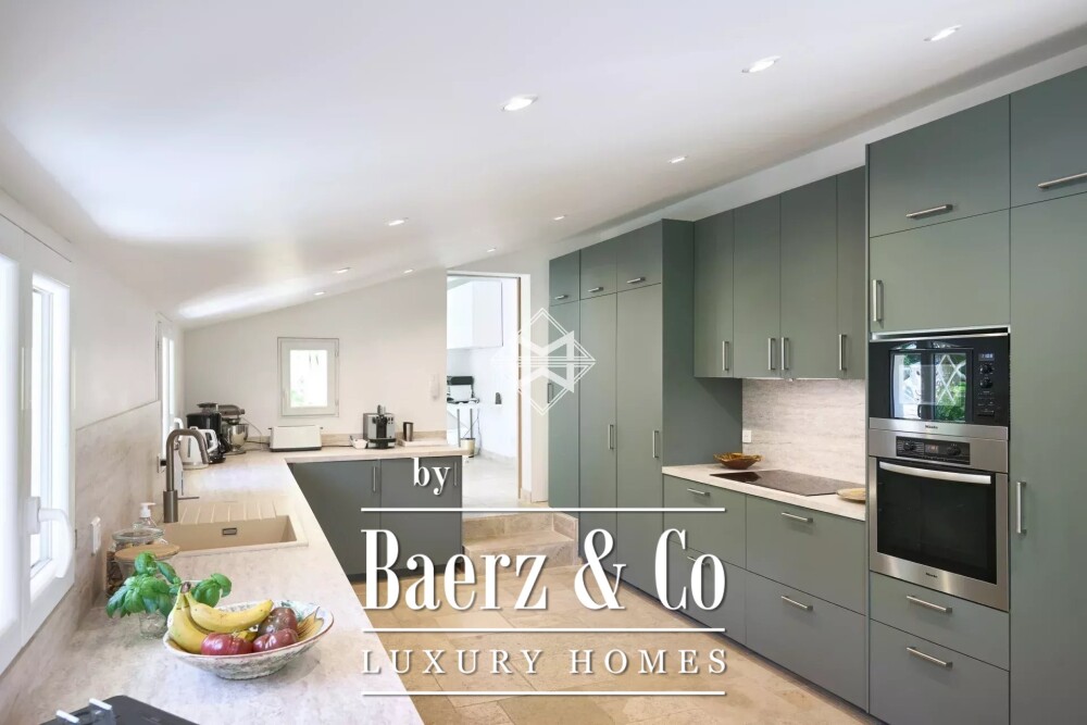 На уровне сада жилое пространство расширяется за счет еще одной гостиной, спальни с санузлом, прачечной и гибкой многозадачной зоны. Южная ориентация наполняет помещения солнцем на участке площадью более 2.300 м² с ухоженным ландшафтом. Отапливаемый бассейн размером 11 x 4 метра и пулхаус расположены в тени взрослых растений; на участке обустроено поле для петанка, создающее атмосферу умиротворённой Прованса. Вид на море и холмы формирует уникальный фон для повседневной жизни.