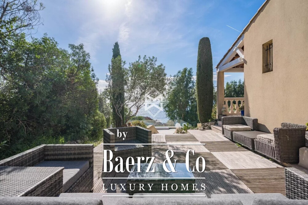 Крытая терраса выходит из гостиной, предлагая тенистое уединение и прямой доступ к бассейну внизу, где морская гладь становится одновременно ландшафтом и фоном. Две спальни и одна ванная комната организованы максимально просто и комфортно, отражая спокойствие окружающих холмов Эстерель.