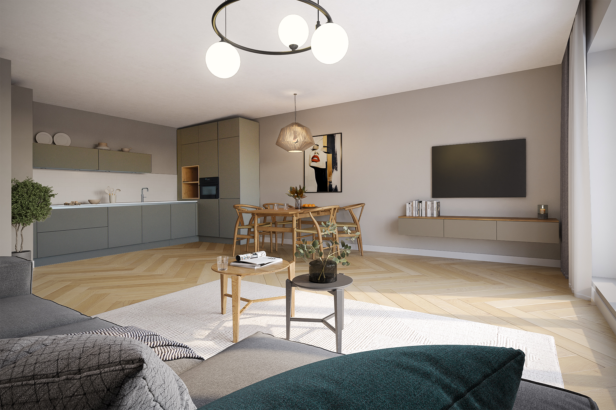 开放式起居空间以NEXT-125厨房为核心,配备复合台面与集成家电,包括Quooker龙头、带内置排风的感应炉灶以及组合烤箱。全屋地暖与制冷系统贯通每个空间,能源效率达A+++级。除技术间外,所有房间皆舒适宜人。南向后阳台俯瞰共用庭院,为居者带来静谧时光,且两间卧室均可直达。