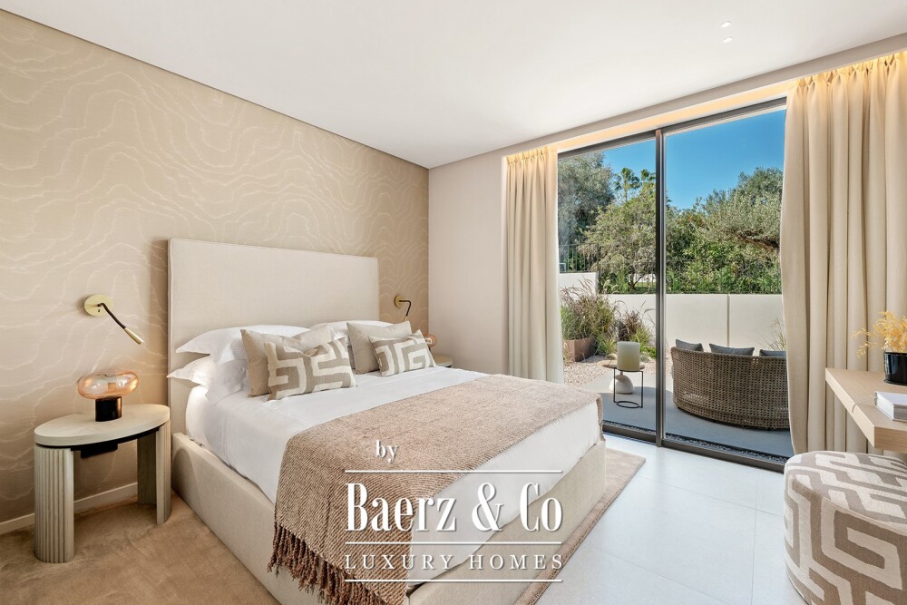 马贝拉一线高尔夫别墅呈现出隐私与全景球道景观交融的建筑体验。别墅建筑面积373平方米,开放式厨房与起居区域无缝连接至宽广露台,落地玻璃窗外正对着Los Naranjos球场的林荫大道。四间套房卧室均可独享私人露台,主人套房近40平方米,设有步入式衣帽间和设计师浴室,营造出精品度假酒店般的氛围。